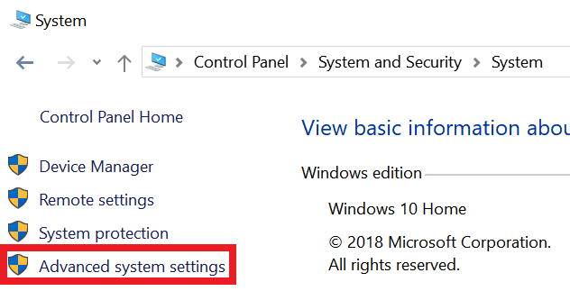 Go to Control Panel -> System and Security -> System -> click ‘Advanced system settings’.