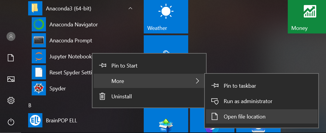 Start -> Anaconda3 -> put the cursor on Jupyter notebook and click right button -> More -> Open file location