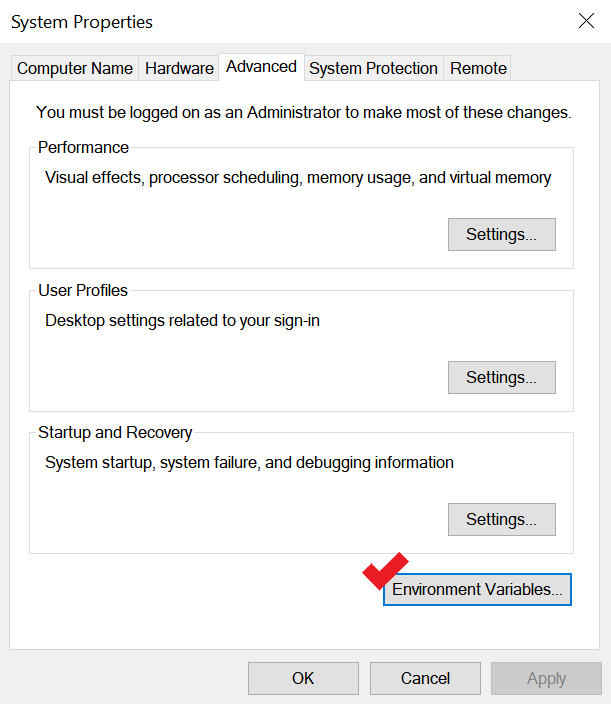 Like we did earlier, go to Control Panel -> System and Security -> System -> Advanced system Settings and click Environment Variables