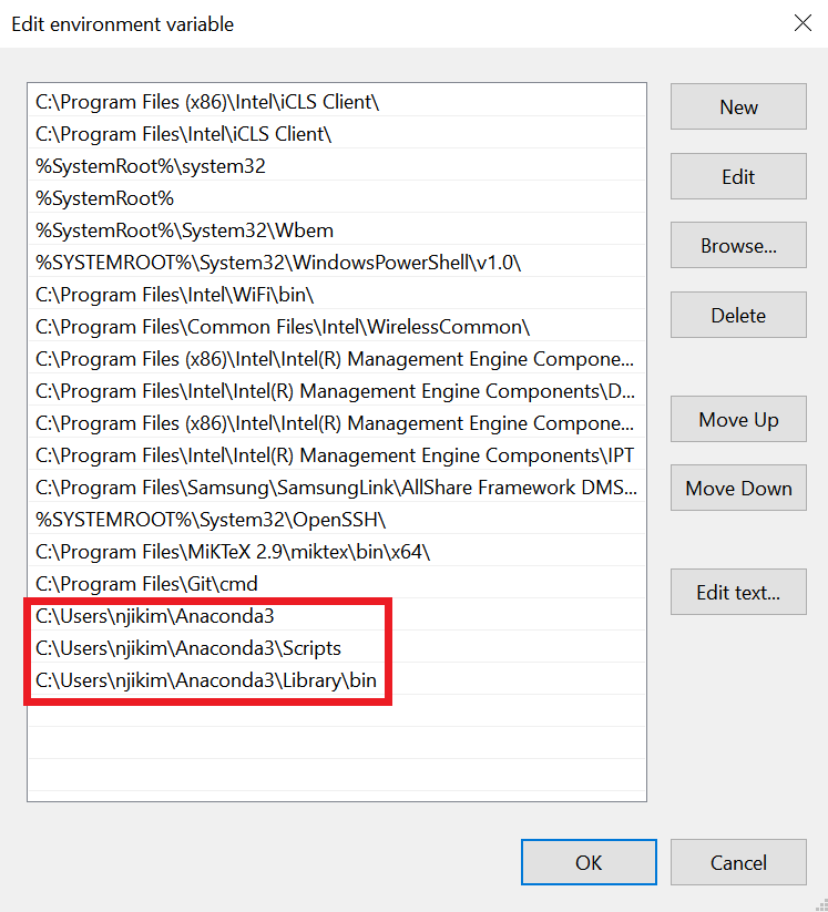 C:/Users/(your username)/Anaconda3 C:/Users/(your username)/Anaconda3/Scripts C:/Users/(your) username)/Anaconda3/Library/binExample: